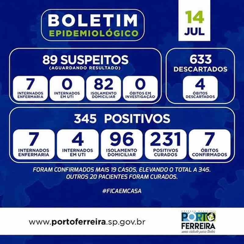 A Vigilância Epidemiológica da Secretaria de Saúde de Porto Ferreira divulgou nesta terça-feira (14/07) o Boletim Epidemiológico nº 100/2020, atendendo à determinação prevista no decreto municipal 1.281/2020.