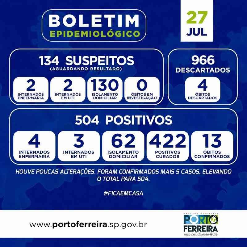 A Vigilância Epidemiológica da Secretaria de Saúde de Porto Ferreira divulgou nesta segunda-feira (27/07) o Boletim Epidemiológico nº 113/2020, atendendo à determinação prevista no decreto municipal 1.281/2020.