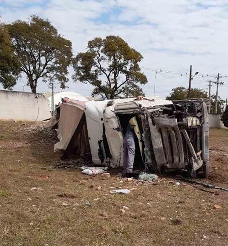 De acordo com a Policia Rodoviária uma carreta atravessou o acostamento, invadiu pista contrária, invadiu área urbana e chocou-se contra um muro, tombando pelo local.