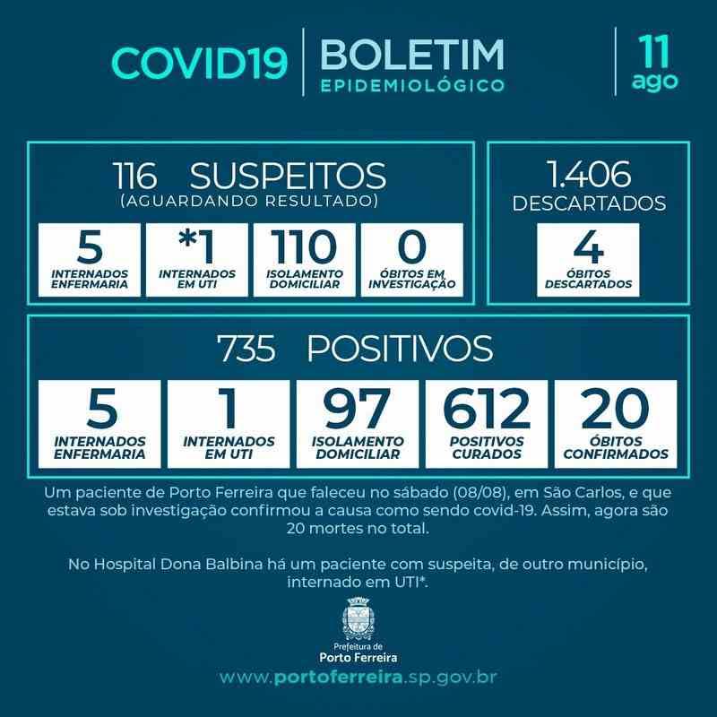Um paciente de Porto Ferreira que faleceu no sábado (08/08), em São Carlos, e que estava sob investigação confirmou a causa como sendo covid-19. Assim, agora são 20 mortes no total. Além disso tivemos a confirmação de 15 novos casos.