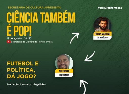 Nesta quinta-feira (13/08), a Secretaria de Cultura de Porto Ferreira vai realizar a edição de agosto do projeto “Ciência também é pop”. Desta vez, com o tema “Futebol e Política, dá jogo?”