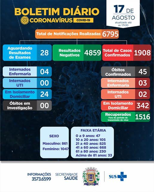 Segundo a parcial de segunda-feira (17), ao todo, a Secretaria de Saúde tem confirmados 1.908 casos (18 a mais) e agora com 45 mortes (cinco a mais). Os pacientes são: