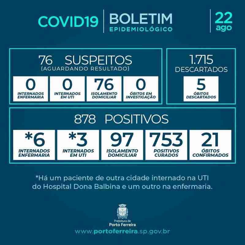 A Vigilância Epidemiológica da Secretaria de Saúde de Porto Ferreira divulgou neste sábado (22/08) o Boletim Epidemiológico nº 138/2020, atendendo à determinação prevista no decreto municipal 1.281/2020.
