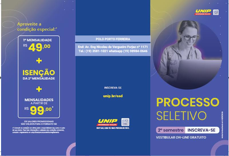 Em Porto Ferreira o Polo da Unip está junto ao Colégio Objetivo na Avenida Eng. Nicolau De V. Forjaz nº 1171, telefones (19) 3581-1021 – 3581-5332 – 3585-3323 e whatsapp (19) 98984-0646