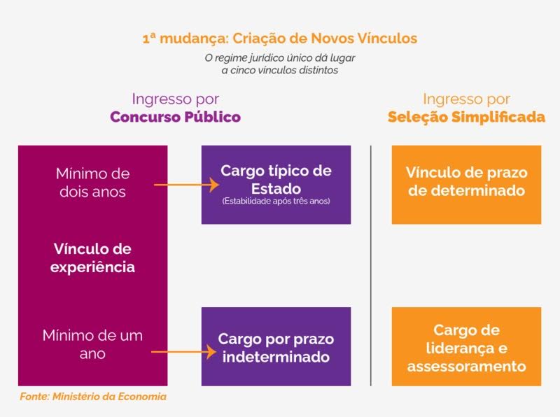 A grande maioria dos novos servidores que passarem nos próximos concursos públicos deve se enquadrar na categoria de “cargos por prazo indeterminado”, que não vão ter estabilidade. Por outro lado, as novas regras permitem que essas pessoas trabalhem em mais de um lugar ao mesmo tempo, o que hoje é proibido para a maioria dos servidores.