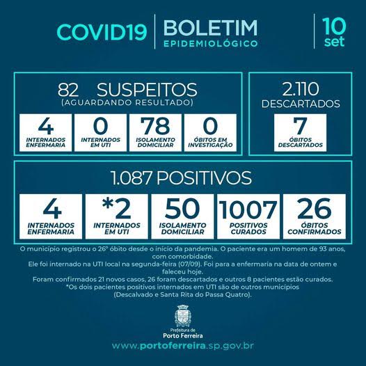 O município registrou o 26º óbito desde o início da pandemia. O paciente era um homem de 93 anos, com comorbidade. Ele foi internado na UTI local na segunda-feira (07/09). Foi para a enfermaria na data de ontem e faleceu hoje.