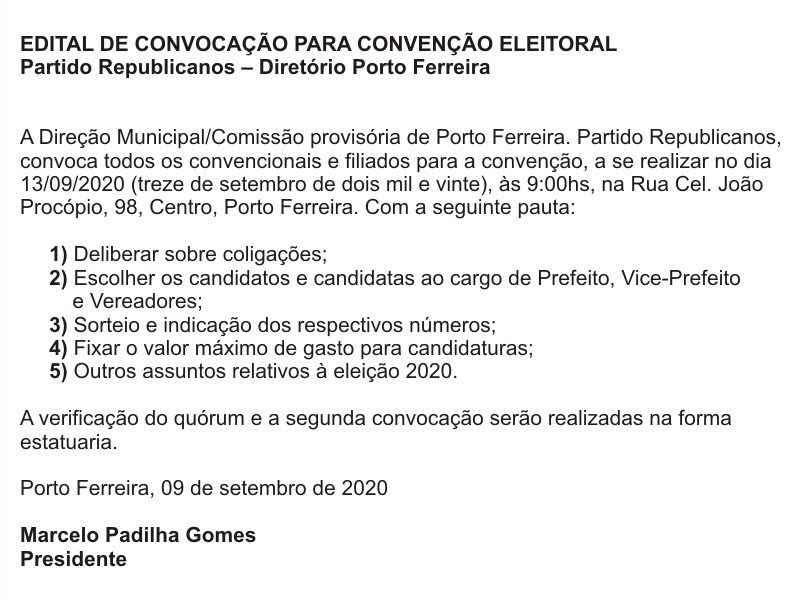 Veja na imagem o Edital de convocação para convenção Eleitoral do Republicanos de Porto Ferreira
