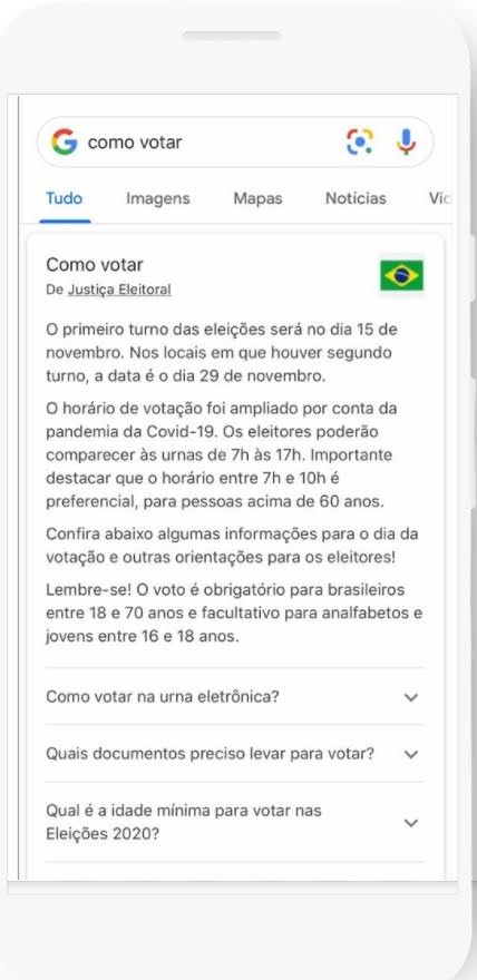 Quando você pesquisar "Como votar" na Busca, aparecerá um painel com informações oficiais fornecidas pelo TSE indicando, por exemplo, quais documentos são necessários, como usar a urna eletrônica, qual a ordem de candidatos para votar e qual o horário da votação. Neste momento de pandemia, também terão destaque os cuidados sanitários indicados pelo Tribunal para os dias de votação para que o eleitor compareça à sua seção eleitoral e vote com segurança.