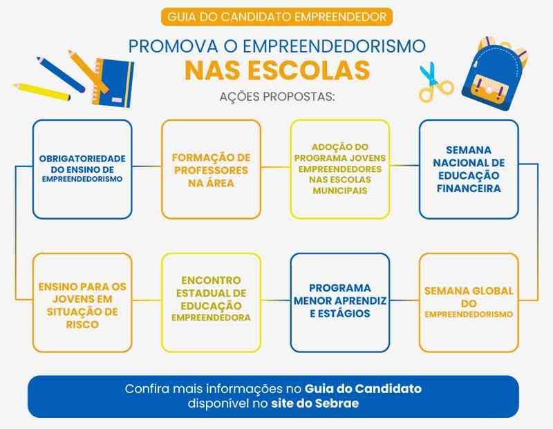 A inclusão do empreendedorismo nas escolas é uma das sugestões do Sebrae para os novos gestores, que serão eleitos no pleito municipal de novembro. A partir do documento “Seja um candidato empreendedor – 10 dicas do Sebrae”, elaborado com parceiros, a entidade estimula prefeitos (as) e vereadores (as) a incluírem pautas voltadas para o empreendedorismo nas propostas de governo.
