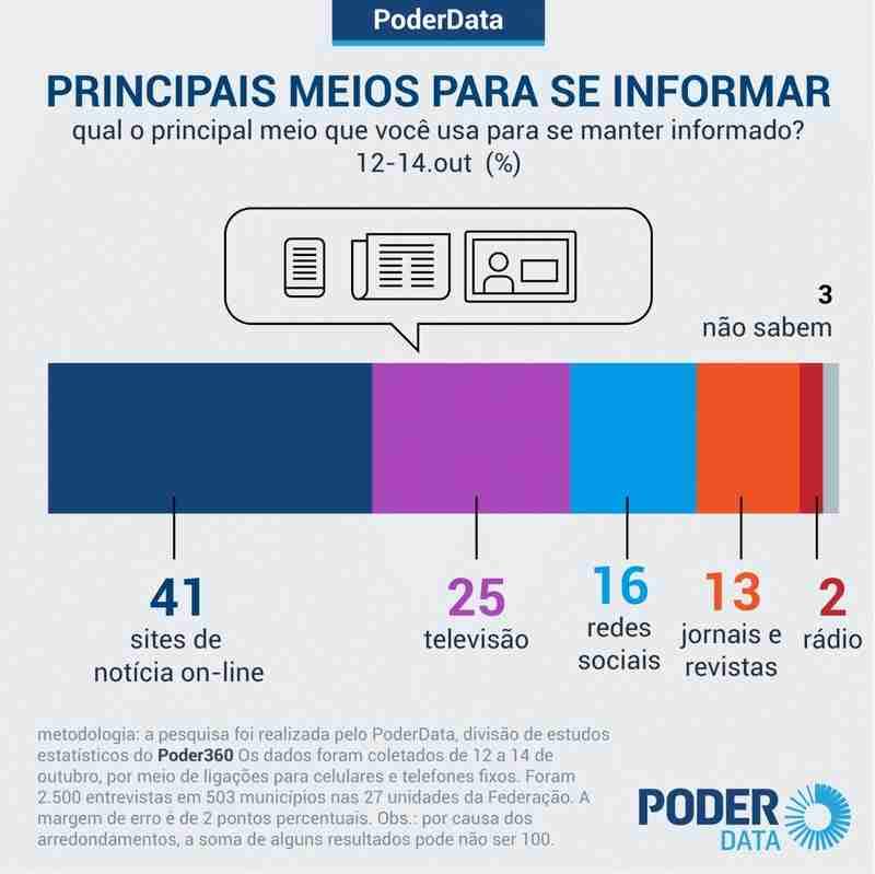 Pesquisa PoderData mostra que 41% dos brasileiros usam veículos jornalísticos na internet como principais meios para se manter informados. Outros 27% citam a televisão e o rádio como a melhor forma para tanto.