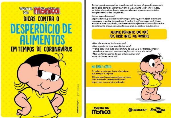 A cartilha ‘Dicas contra o desperdício de alimentos em tempos de coronavírus’, ilustrada com os personagens da Turma da Mônica, foi desenvolvida a partir da parceria entre a Maurício de Sousa Produções (MSP), Embrapa (Empresa Brasileira de Pesquisa Agropecuária), e a Ceagesp (Companhia de Entrepostos e Armazéns Gerais de São Paulo).