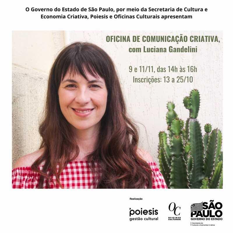 Pensando na Comunicação como um dispositivo criativo dentro de um projeto cultural e como uma ferramenta para empoderar as pessoas que atuam nele, nos dias 09 e 11 de Novembro de 2020, das 14h00 às 16h00, através da Plataforma Zoom, a jornalista e consultora de comunicação Luciana Gandeliniministrará uma Oficina de Comunicação Criativa.