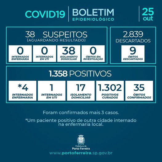 A Vigilância Epidemiológica da Secretaria de Saúde de Porto Ferreira divulgou neste domingo (25/10) o Boletim Epidemiológico nº 202/2020, atendendo à determinação prevista no decreto municipal 1.281/2020.
