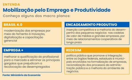 O programa Mobilização pelo Emprego e Produtividade, liderado pela pasta da Economia, reúne macro planos e iniciativas já em andamento para a retomada econômica no Brasil em meio à pandemia.