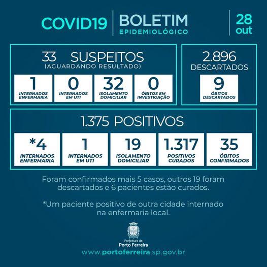 A Vigilância Epidemiológica da Secretaria de Saúde de Porto Ferreira divulgou nesta quarta-feira (28/10) o Boletim Epidemiológico nº 205/2020, atendendo à determinação prevista no decreto municipal 1.281/2020.