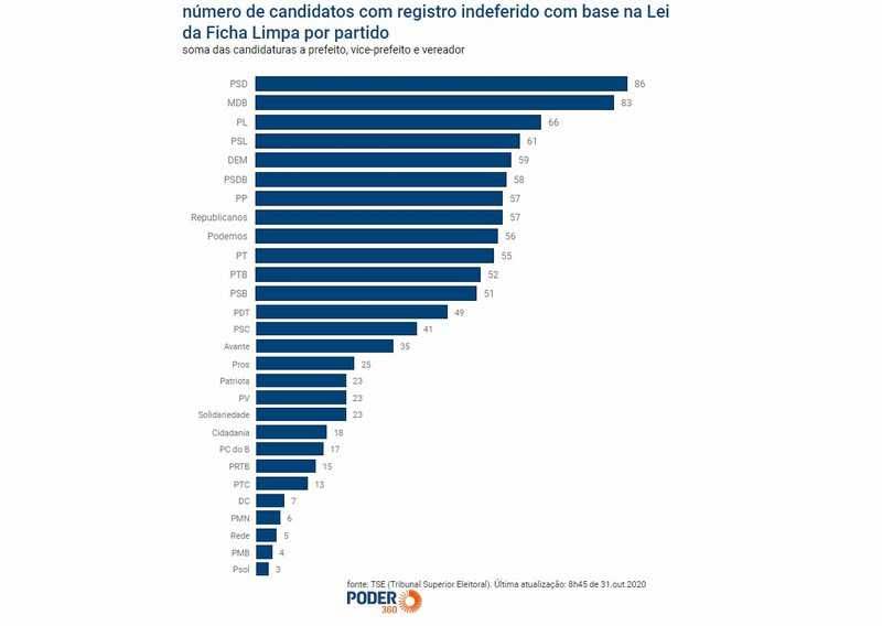 Ao menos 1.048 candidatos às eleições deste ano tiveram seus registros negados pela Justiça Eleitoral por não se enquadrarem nos critérios de corte da Lei da Ficha Limpa. O número, consultado no sábado (31.out.2020) pela reportagem do Poder360 na base de dados do TSE (Tribunal Superior Eleitoral),