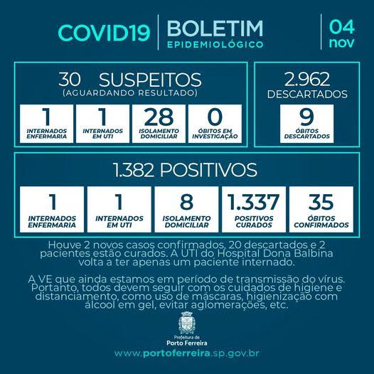 A Vigilância Epidemiológica da Secretaria de Saúde de Porto Ferreira divulgou nesta quarta-feira (04/11) o Boletim Epidemiológico nº 212/2020, atendendo à determinação prevista no decreto municipal 1.281/2020.