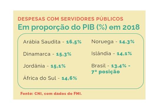 Os gastos do Brasil com o funcionalismo público da União, dos estados e dos municípios equivaleram a 13,4% do PIB (Produto Interno Bruto) em 2018, segundo dados do Fundo Monetário Internacional (FMI). Entre mais de 70 nações, o País é um dos que têm as despesas mais elevadas com servidores públicos ativos e inativos, proporcionalmente ao PIB, segundo a nota econômica “O peso do funcionalismo público no Brasil em comparação com outros países", elaborada pela CNI (Confederação Nacional da Indústria).