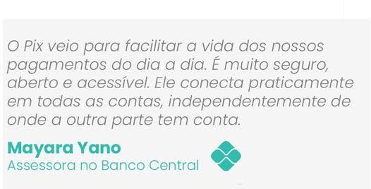 “O Pix veio para facilitar a vida dos nossos pagamentos do dia a dia. Ele é um novo jeito de fazer pagamento e transferências criado pelo Banco Central, em conjunto com a indústria”, adianta a assessora no Departamento de Competição e Estrutura do Mercado Financeiro do Banco Central, Mayara Yano.