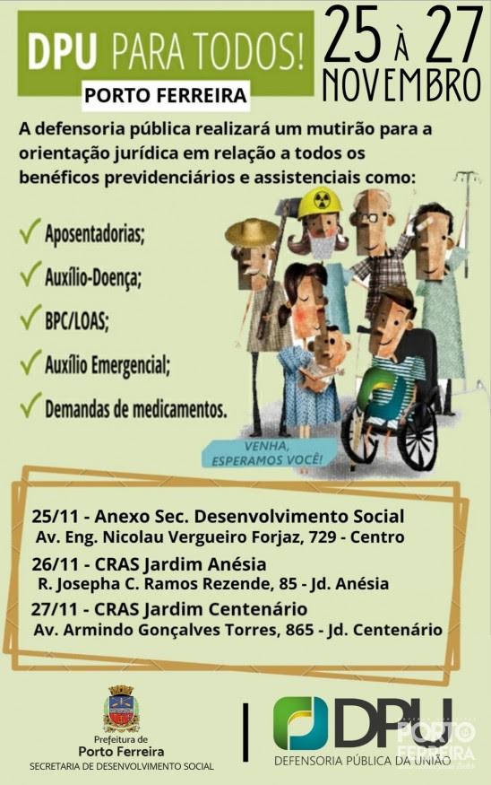 Os moradores de Porto Ferreira contarão com assistência jurídica gratuita, por meio da ação itinerante DPU para Todos, promovida pela Defensoria Pública da União (DPU). A ação tem como foco sanar dúvidas jurídicas da população e realizar atendimentos especializados e individualizados. As dúvidas mais frequentes são em relação ao Instituto Nacional do Seguro Social (INSS) e ao Auxílio Emergencial.