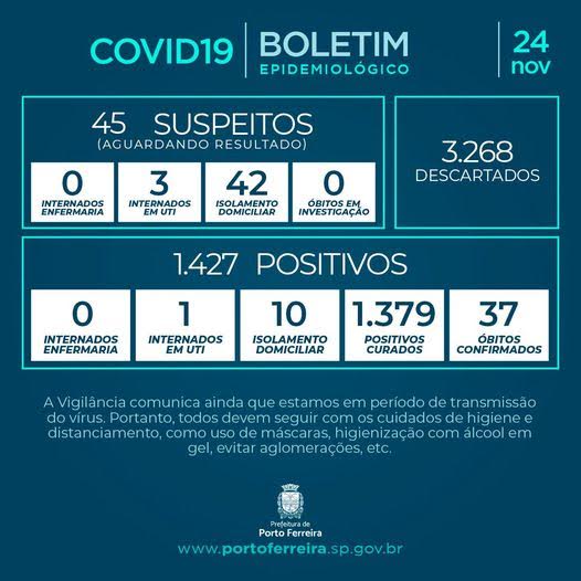 A Vigilância Epidemiológica da Secretaria de Saúde de Porto Ferreira divulgou nesta terça-feira (24/11) o Boletim Epidemiológico nº 230/2020, atendendo à determinação prevista no decreto municipal 1.281/2020.