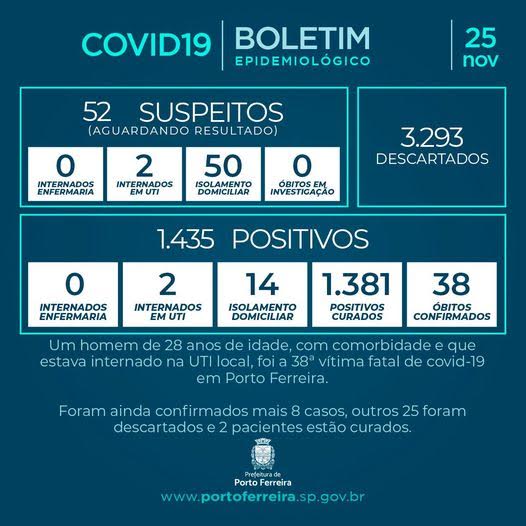Um homem de 28 anos de idade, com comorbidade e que estava internado na UTI local, foi a 38ª vítima fatal de covid-19 em Porto Ferreira.
