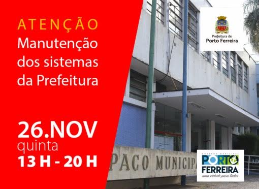 A Prefeitura de Porto Ferreira informa que está agendada uma parada programada para manutenção dos sistemas de informática nesta quinta-feira (26/11), a partir das 13 horas, com retorno previsto para as 20 horas.