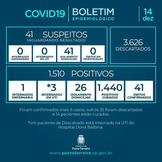 A Vigilância Epidemiológica da Secretaria de Saúde de Porto Ferreira divulgou nesta segunda-feira (14/12) o Boletim Epidemiológico nº 2500/2020, atendendo à determinação prevista no decreto municipal 1.281/2020.