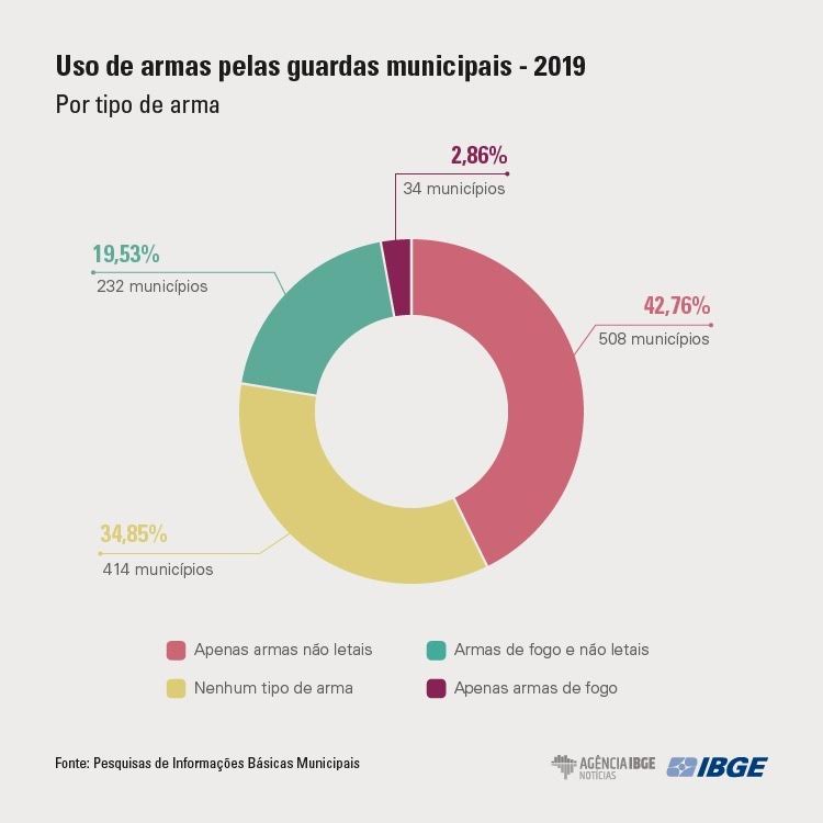 Segundo a Pesquisa de Informações Básicas Municipais, do IBGE, o percentual de cidades, onde a Guarda Municipal utilizava armas de fogo, subiu de 15,6%, em 2014, para 22,4% em 2019. Já em 34,8% dos municípios que tinham Guarda Municipal, o efetivo não portava nenhum tipo de arma.