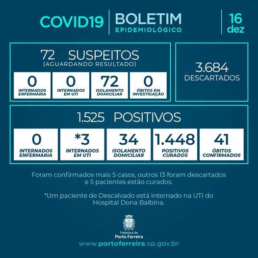 A Vigilância Epidemiológica da Secretaria de Saúde de Porto Ferreira divulgou nesta quarta-feira (16/12) o Boletim Epidemiológico nº 252/2020, atendendo à determinação prevista no decreto municipal 1.281/2020.
