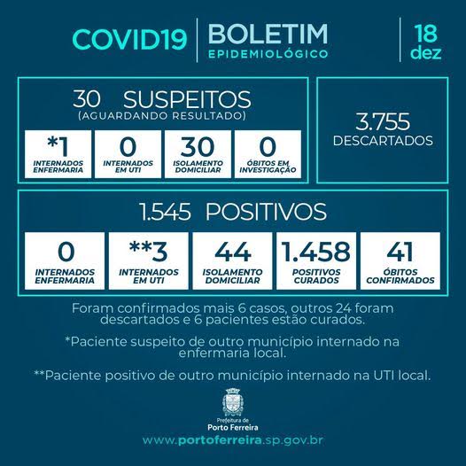 A Vigilância Epidemiológica da Secretaria de Saúde de Porto Ferreira divulgou nesta sexta-feira (18/12) o Boletim Epidemiológico nº 254/2020, atendendo à determinação prevista no decreto municipal 1.281/2020.
