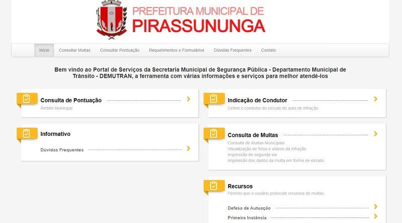 A Secretaria Municipal de Segurança Pública da Prefeitura de Pirassununga passou a oferecer diversos serviços do Demutran (Departamento Municipal de Trânsito) de forma online, por meio de um site exclusivo. Para acessá-lo basta entrar em “https://pirassununga.sp.gov.br/” e no menu superior do Site escolher “Prefeitura”, depois “Demutran” e clicar finalmente em “Multas de Trânsito”, sendo direcionado ao Portal de Serviços da Secretaria de Segurança (também encontrado no link “https://pirassununga.consultacidadao.com.br/”)