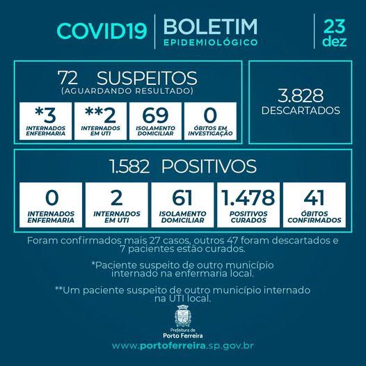 A Vigilância Epidemiológica da Secretaria de Saúde de Porto Ferreira divulgou nesta quarta-feira (23/12) o Boletim Epidemiológico nº 258/2020, atendendo à determinação prevista no decreto municipal 1.281/2020.