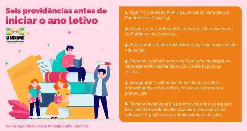 A agenda elenca doze assuntos aos quais os secretários municipais de Educação devem se ater durante os primeiros três meses de governo. Entre eles estão a relação de providências para o início do ano letivo — hoje bastante associada a ações para o combate a pandemia da Covid-19 na volta às aulas presenciais —, os números da demanda escolar e um levantamento das necessidades básicas para que as escolas funcionem regularmente.