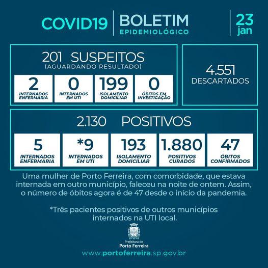 Uma mulher de Porto Ferreira, com comorbidade, que estava internada em outro município, faleceu na noite de ontem. Assim, o número de óbitos agora é de 47 desde o início da pandemia.