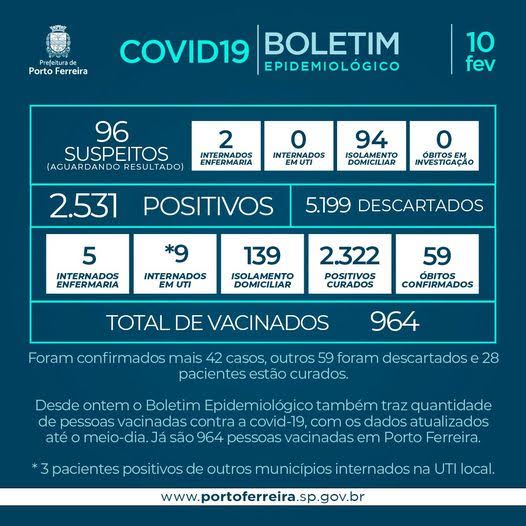 A Vigilância Epidemiológica da Secretaria de Saúde de Porto Ferreira divulgou nesta quarta-feira (10/02) o Boletim Epidemiológico nº 304/2021, atendendo à determinação prevista no decreto municipal 1.281/2020.