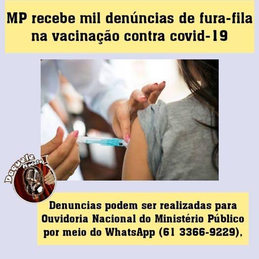 A Ouvidoria Nacional do Ministério Público informou que recebeu 1.065 denúncias sobre casos de fura-fila na vacinação contra covid-19 em todo o país. Há duas semanas, o órgão passou a receber denúncias sobre pessoas que foram imunizadas e não estavam na categoria de prioritários do programa de vacinação.