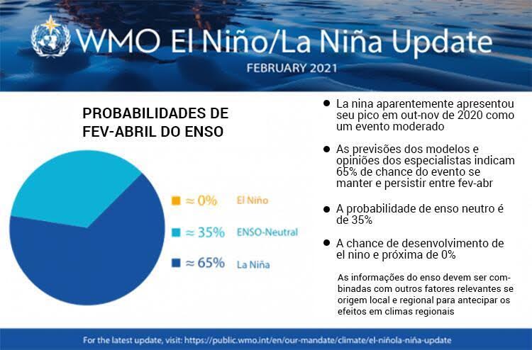 La Niña parece ter atingido o pico em outubro-novembro como um evento de força moderada. Há uma probabilidade de 65% de que persista durante fevereiro-abril, com 70% de chance de que o Pacífico tropical retorne às condições neutras do ENSO na temporada de abril-junho de 2021, de acordo com a atualização El Niño-La Niña da OMM .