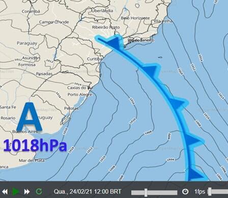 Acompanhando a frente fria, um sistema de alta pressão(massa de ar frio), avança também para o Sudeste. Essa massa de ar frio não é forte, mas tem potencial para provocar diminuição da temperatura no Sudeste do Brasil em relação aos últimos dias.