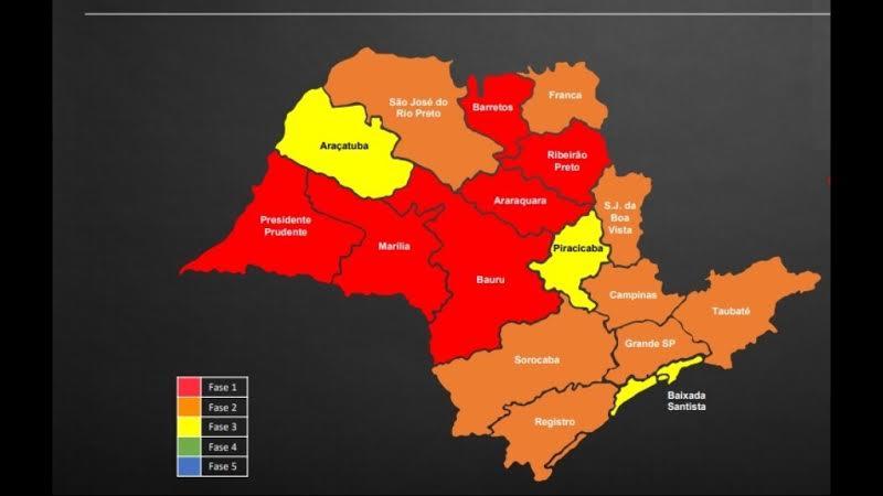 Segundo a gestão João Doria (PSDB), a atualização desta sexta-feira (26) traz a regressão das regiões de Ribeirão Preto e Marília, da laranja para vermelha, Campinas, Sorocaba, Registro e Grande São Paulo, da amarela para laranja e o avanço da região de Piracicaba, da laranja para amarela.