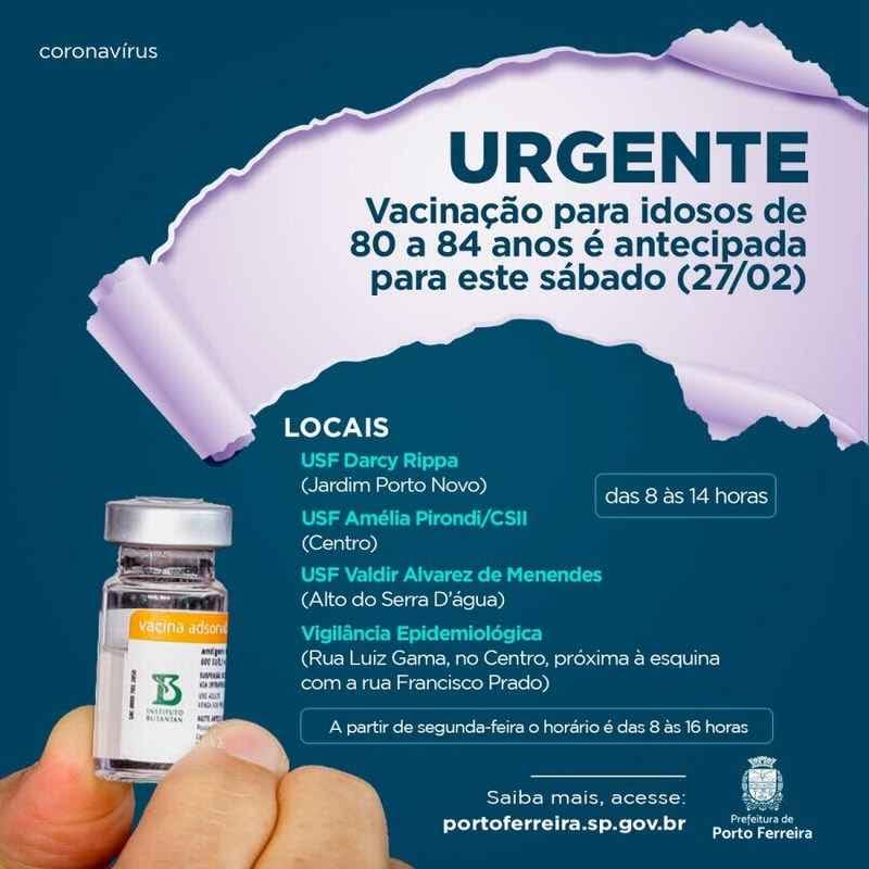 A Secretaria de Saúde de Porto Ferreira informa que antecipou a vacinação no público idoso com idade entre 80 e 84 anos para este sábado (27/02). O horário será das 8h às 14 horas.