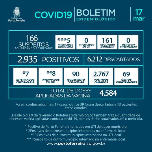 A Vigilância Epidemiológica da Secretaria de Saúde de Porto Ferreira divulgou nesta quarta-feira (17/03) o Boletim Epidemiológico nº 339/2021, atendendo à determinação prevista no decreto municipal 1.281/2020.