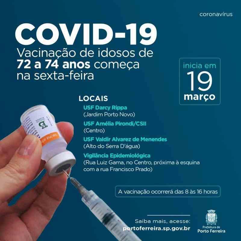 A Secretaria de Saúde de Porto Ferreira informa que iniciará a vacinação contra a covid-19 no público idoso com idade de 72 a 74 anos nesta sexta-feira (19/03), no horário das 8h às 16h. No sábado também haverá plantão, no horário das 8h às 14h, para o público acima de 72 anos de idade.