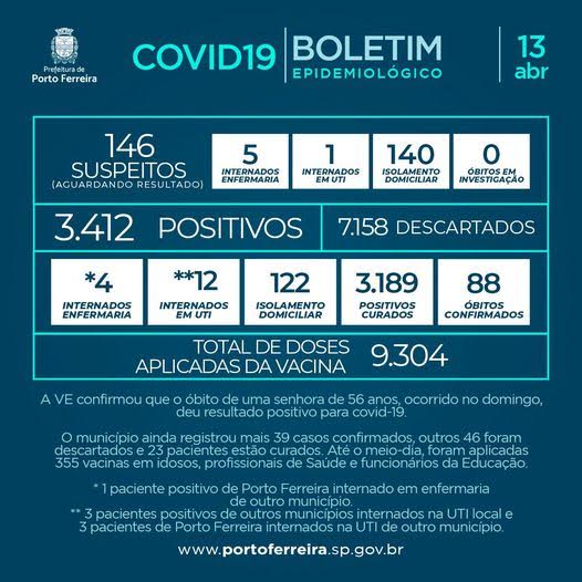A Vigilância Epidemiológica da Secretaria de Saúde de Porto Ferreira divulgou nesta terça-feira (13/04) o Boletim Epidemiológico nº 366/2021, atendendo à determinação prevista no decreto municipal 1.281/2020.