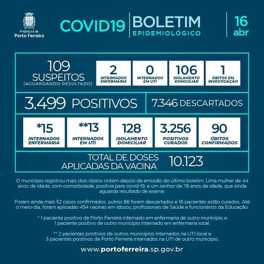 A Vigilância Epidemiológica da Secretaria de Saúde de Porto Ferreira divulgou nesta sexta-feira (16/04) o Boletim Epidemiológico nº 369/2021, atendendo à determinação prevista no decreto municipal 1.281/2020.