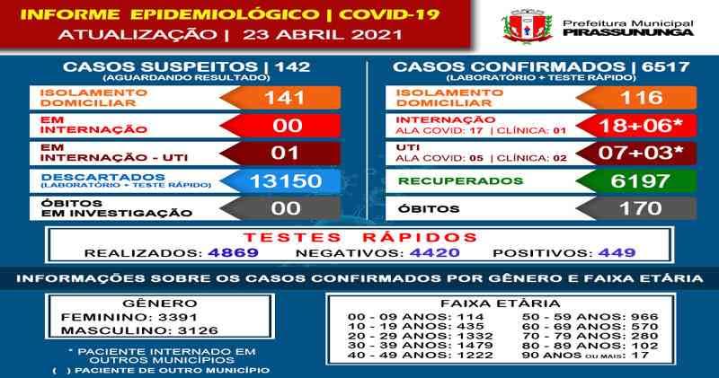 Com mais dois óbitos ocorridos nos dias 19/4, uma mulher de 62 anos e, um de um homem de 65 anos, registrado no último dia 21, a Vigilância Epidemiológica e Imunização da cidade de Pirassununga/SP, divulgou no final da tarde desta sexta-feira, 23, os novos números do Covid – 19.