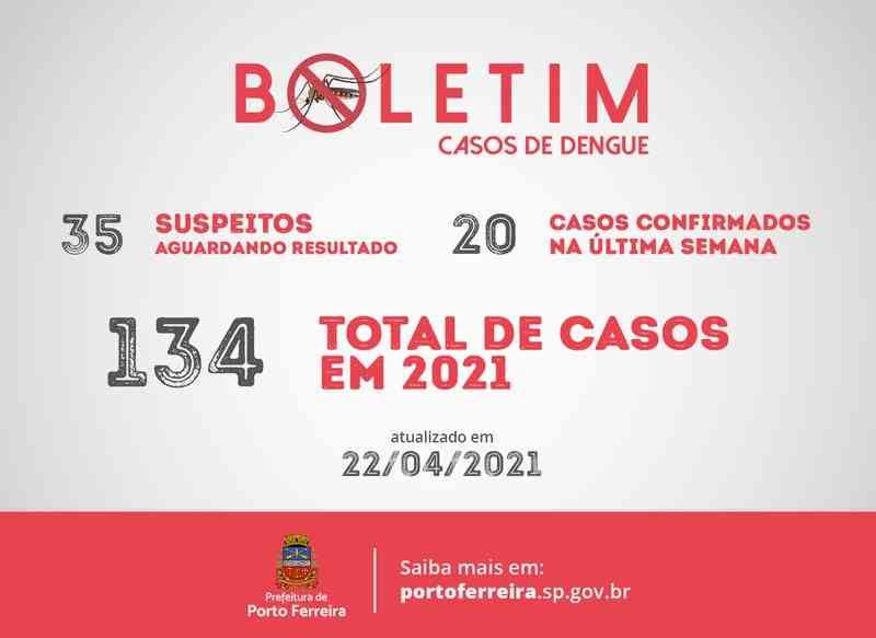 A Seção de Controle de Vetores da Secretaria de Saúde de Porto Ferreira informa nova atualização dos casos de dengue notificados no município. Desde a última semana foram confirmados mais 20 casos e 35 suspeitas aguardam por resultados de exames. Assim, o número de pacientes positivos este ano subiu para 134.