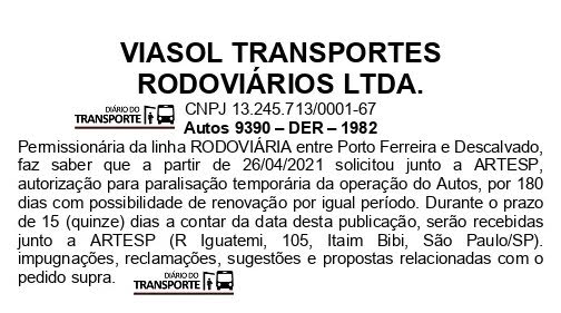 A empresa ViaSol Transportes Rodoviários solicitou à Agência Reguladora de Serviços Públicos Delegados de Transporte do Estado de São Paulo – ARTESP autorização para a paralisação da operação da linha rodoviária que faz a ligação Porto Ferreira a Descalvado.