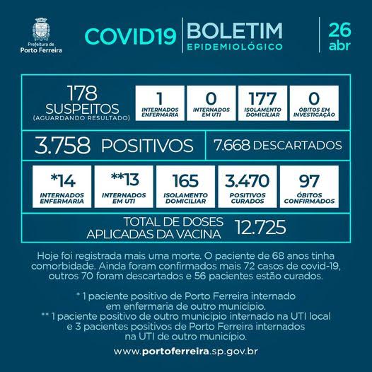 A Vigilância Epidemiológica da Secretaria de Saúde de Porto Ferreira divulgou nesta segunda-feira (26/04) o Boletim Epidemiológico nº 379/2021, atendendo à determinação prevista no decreto municipal 1.281/2020.