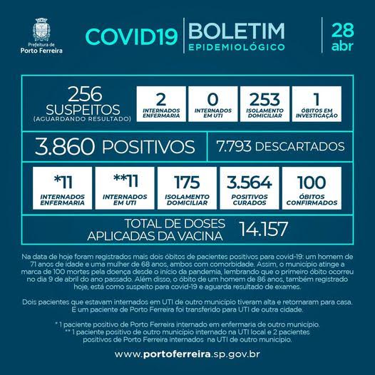 A Vigilância Epidemiológica da Secretaria de Saúde de Porto Ferreira divulgou nesta quarta-feira (28/04) o Boletim Epidemiológico nº 381/2021, atendendo à determinação prevista no decreto municipal 1.281/2020.
